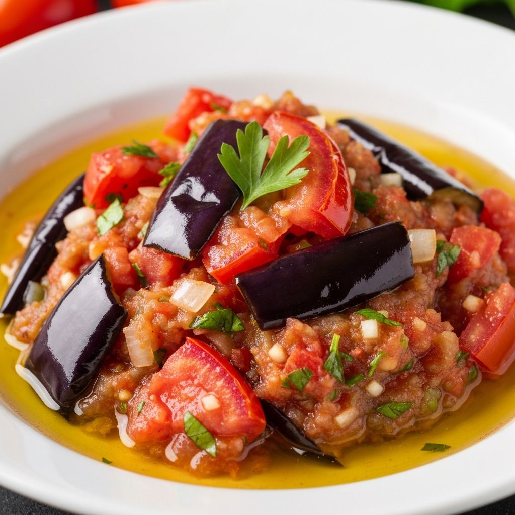 Ateşte kavrulmuş patlıcan, domates, biber, maydanoz ve limon sosla karışımı. Bu kırsal salata basit ve taze malzemelerin kombinasyonuyla oluşan leziz bir mezedir.